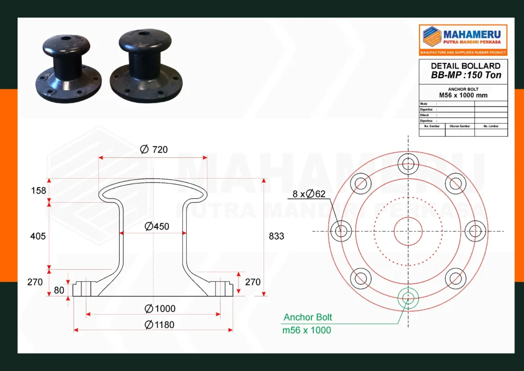 Kami di MPM Perkasa memahami bahwa pengadaan bollard kapasitas besar adalah investasi infrastruktur yang serius. Oleh karena itu, kami menyertakan paket lengkap dalam setiap pembelian. Anda tidak hanya mendapatkan unit bollard, tetapi juga set lengkap Baut Angkur (Anchor Bolts) berkualitas tinggi yang telah melalui proses Hot Dip Galvanizing. Baut-baut ini adalah kunci utama yang menahan bollard tetap menyatu dengan dermaga saat beban puncak 150 ton terjadi.