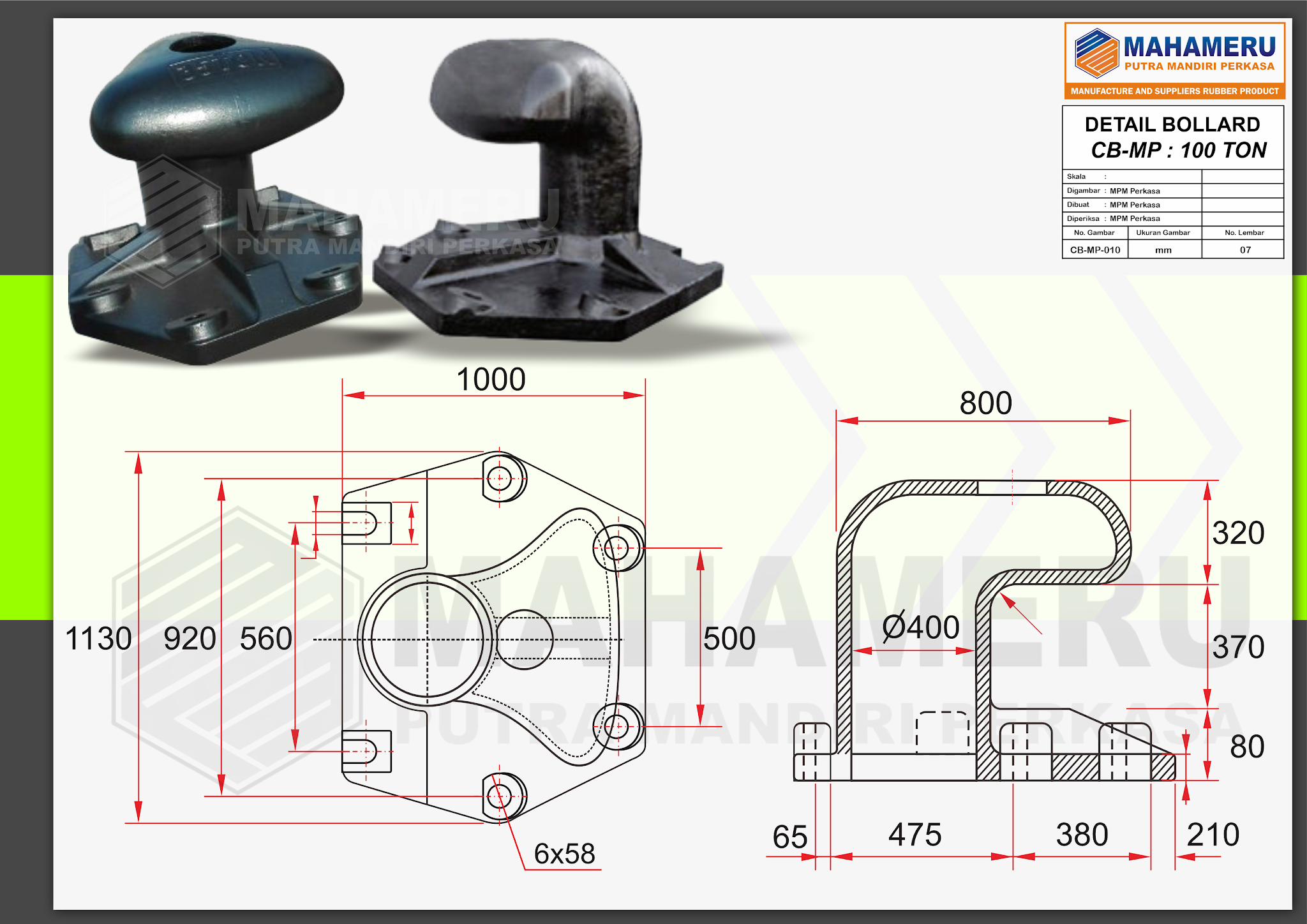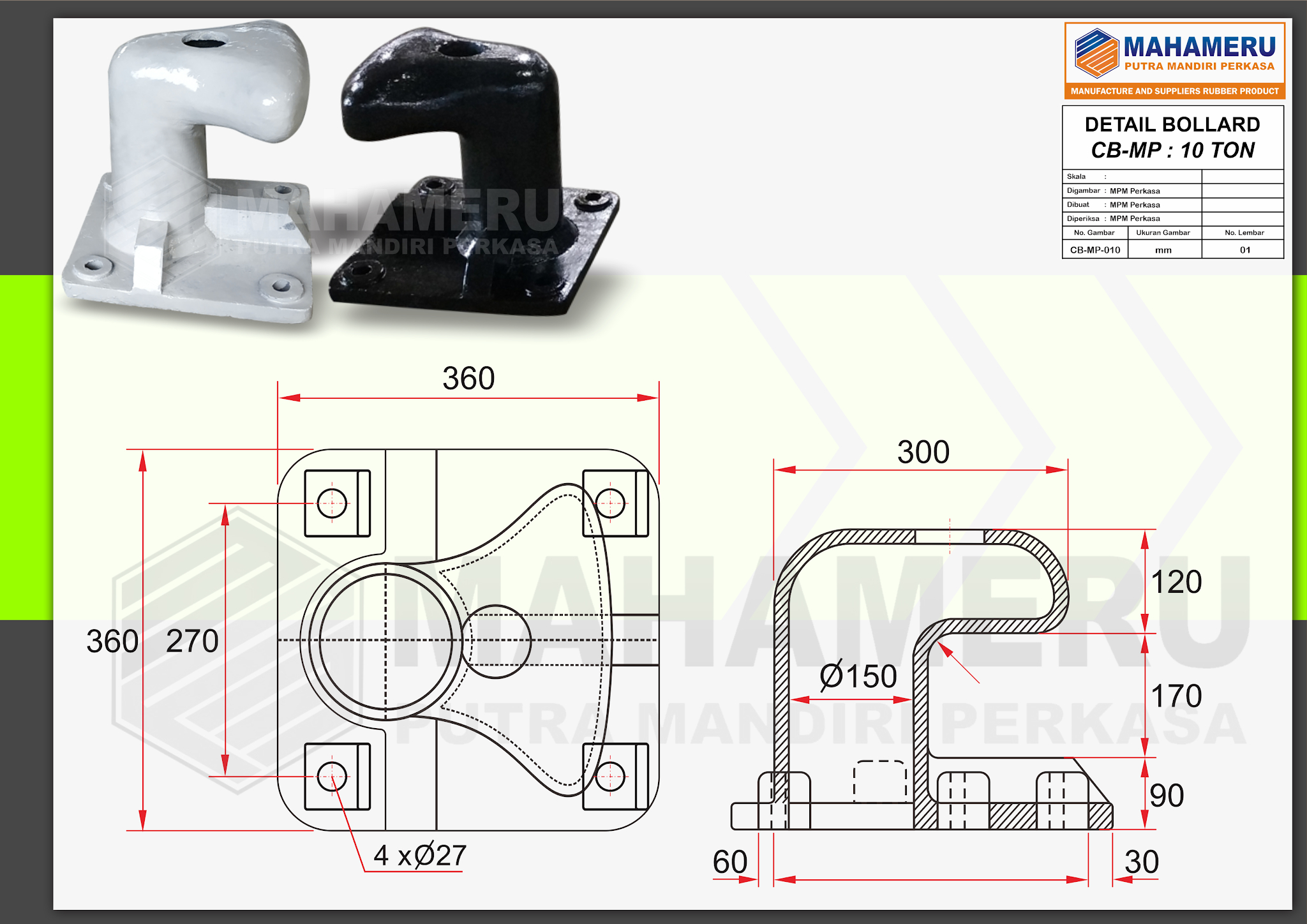 Mahameru Putra Mandiri Perkasa (MPM Perkasa) adalah perusahaan yang bergerak di bidang industri karet, khususnya dalam produksi berbagai jenis produk karet berkualitas tinggi. Salah satu produk unggulan kami adalah Harbour Bollard Dermaga, yang memiliki peran penting dalam sistem tambat kapal di pelabuhan.