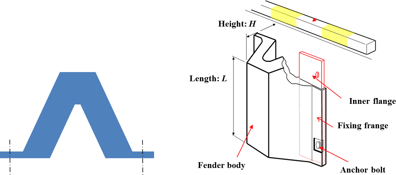 Marine Dock Fender V banyak digunakan sebagai fender karet pertama dengan performa tipe tekuk. Bentuk penampang khas dan pemasangan fender karet berbentuk V ditunjukkan pada Gambar 3.4.1.