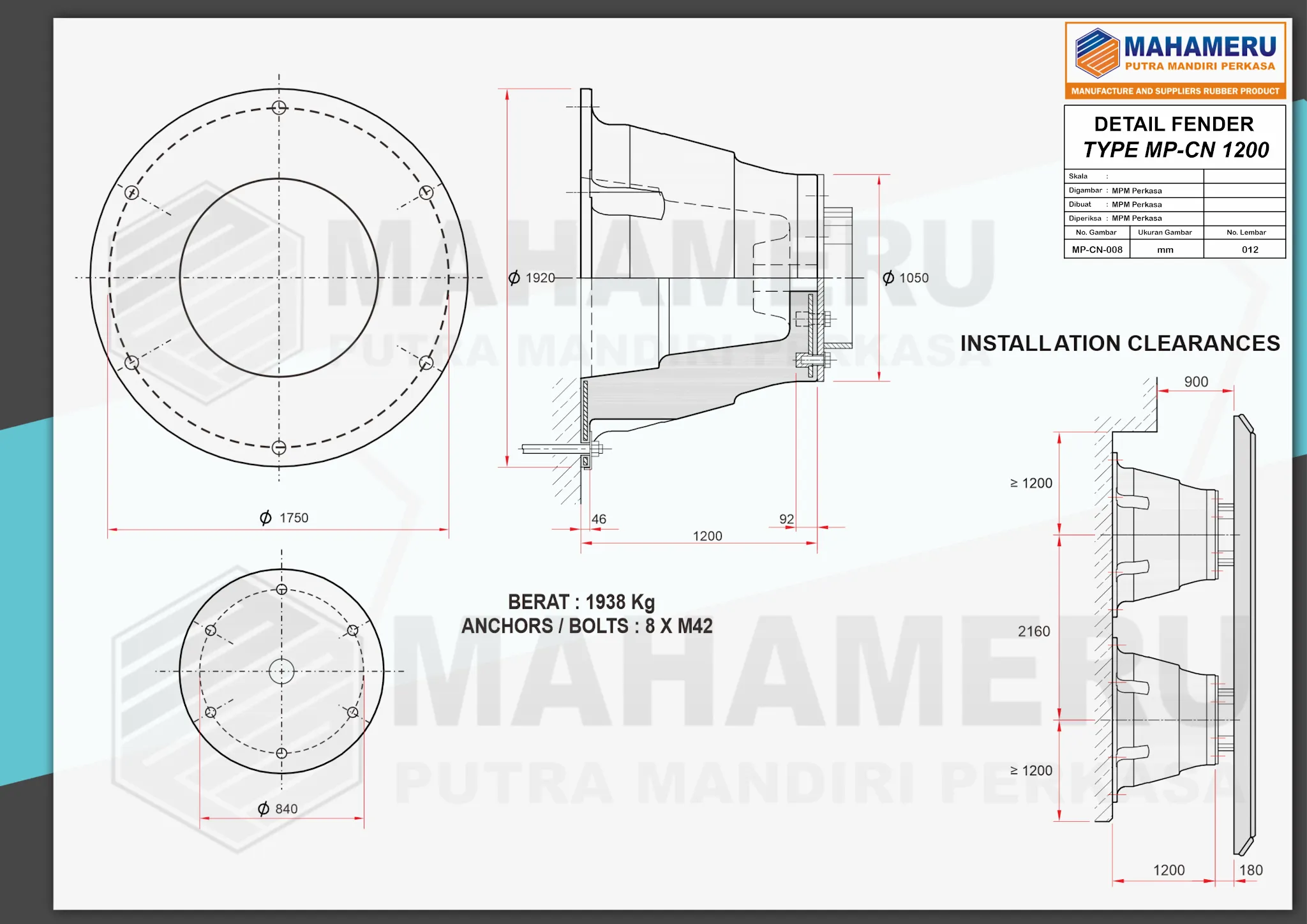 Secara umum, Rubber Fender Cone 1200 H dari MPM Perkasa memiliki karakteristik sebagai berikut: