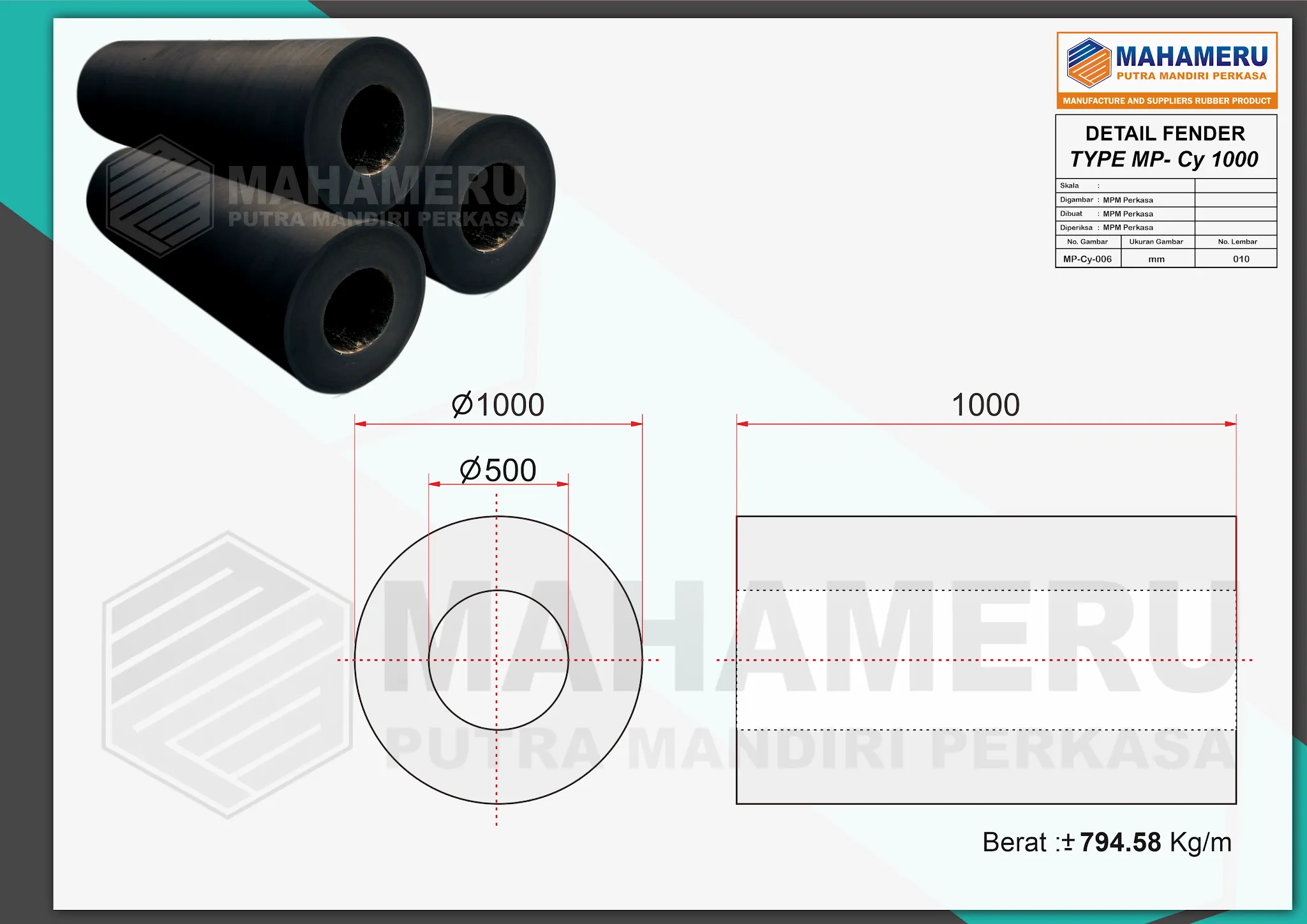 Sebagai penyedia solusi maritim dan industri, MPM Perkasa memastikan Karet Fender Cylinder 1000 H diproduksi dengan standar kualitas tinggi dan material pilihan.