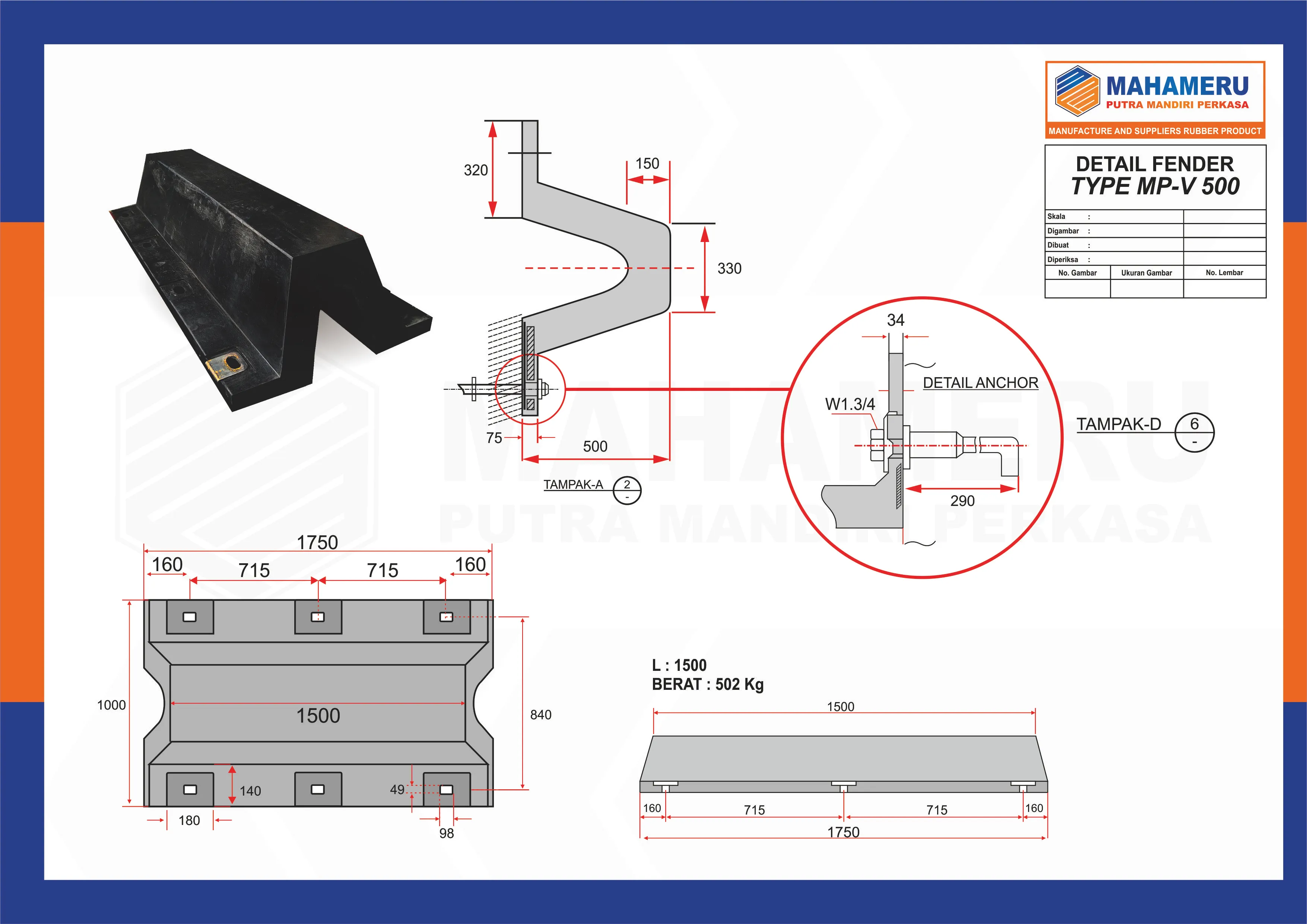 Rubber Fender V 500 H – 1500 L bukanlah sekadar pelindung dermaga biasa, melainkan komponen infrastruktur kritis yang dirancang untuk menahan dan mengelola benturan dari kapal-kapal berkapasitas besar dan berbobot mati tinggi (deadweight tonnage). Dengan tinggi 500 mm (V 500 H) dan panjang unit 1500 mm (1500 L), fender ini adalah solusi yang teruji untuk Terminal Peti Kemas, Terminal LNG, dan fasilitas pelabuhan yang melayani kapal Tanker atau Bulk Carrier raksasa.