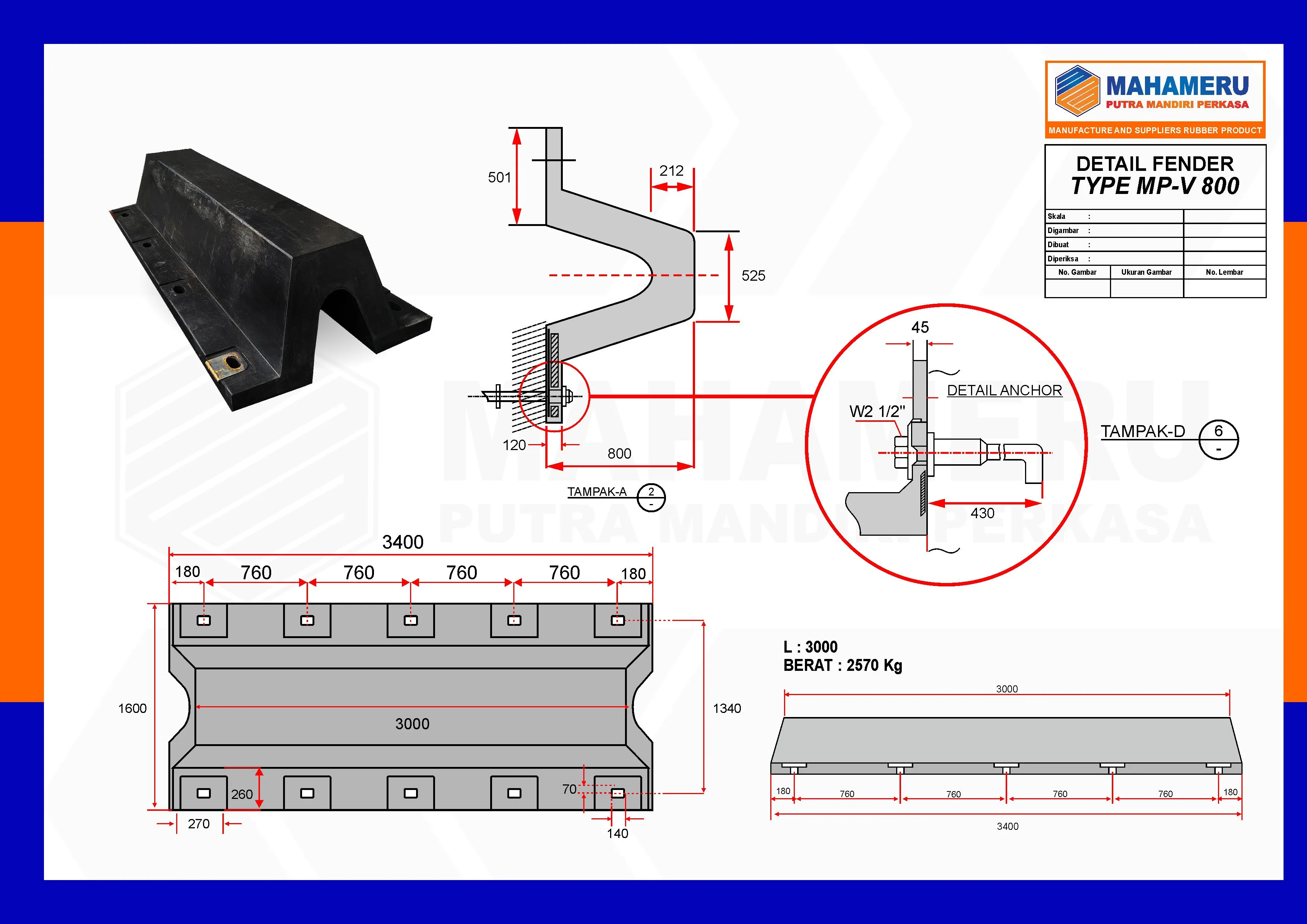Spesifikasi atau Gambar detail Rubber Fender Tipe V 800H – 3500L :