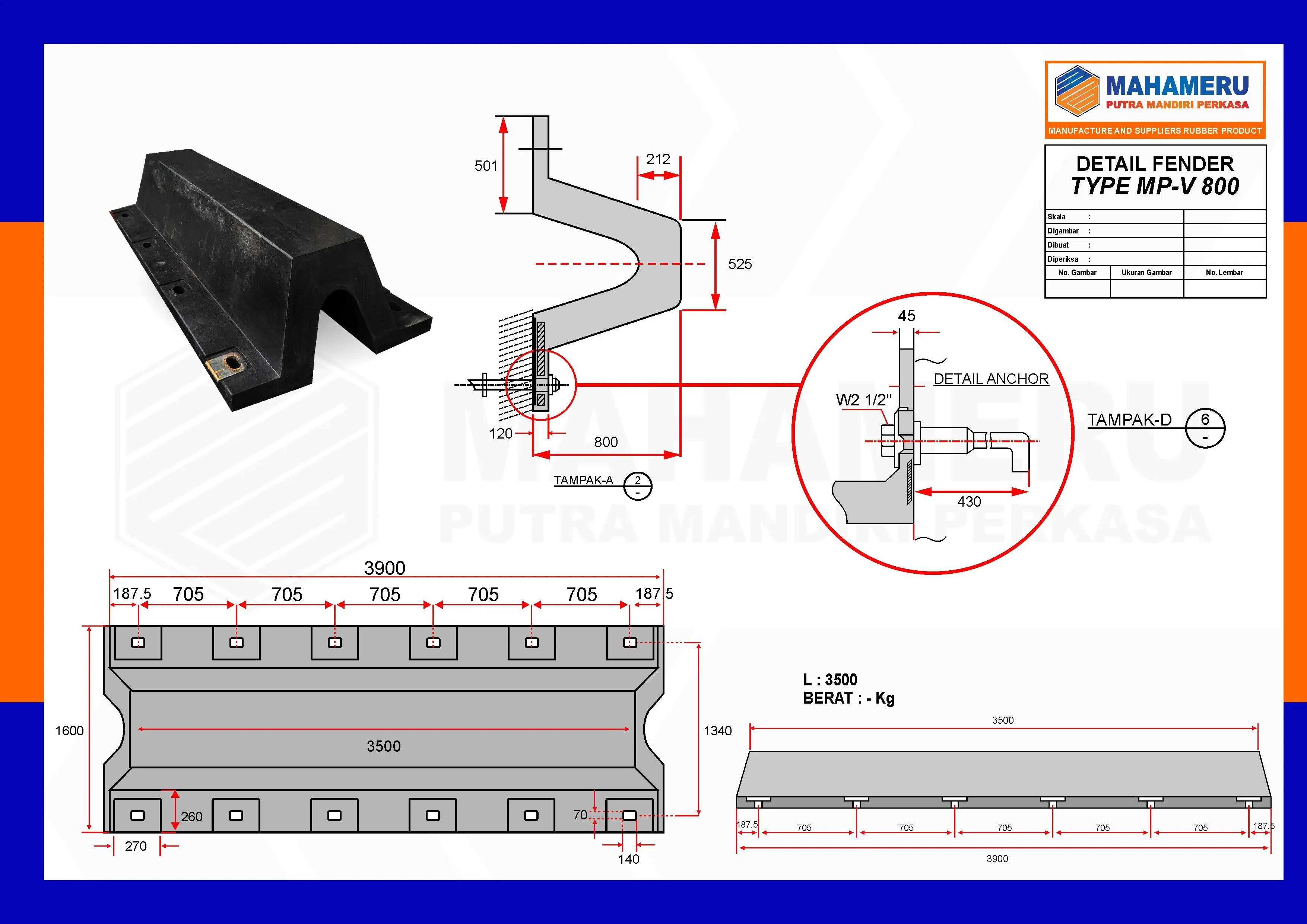 Rubber Fender V 800H – 3500L adalah varian heavy-duty dengan dimensi panjang di atas rata-rata. Jika fender standar biasanya memiliki panjang 1000mm hingga 2000mm, varian 3500mm ini menawarkan solusi proteksi continuous yang lebih efisien untuk jenis dermaga tertentu.